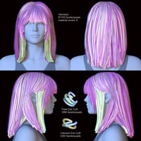 The hair is fully conforming and is rigged with 9 extra bones, that can be used for subtle adjustments to the posing, if needed. The hair features underline material zones that create a peek-a-boo color effect. Ear cuffs of triple rings and intersecting double rings are included to emphasize the ears, adding a playful touch.