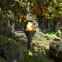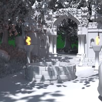 This detailed 3D environment features moss-covered stone ruins, dense leafy foliage, a sacred fire-lit archway, and enchanted forest ambiance perfect for storytelling, RPG scenes, or magical encounters.