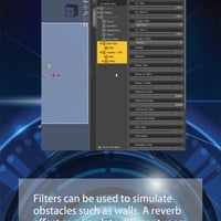 Sound sources and listeners can be placed directly in the scene. The plugin calculates the strength of the sound depending on the distance and orientation of the sound source. Using filters and reverb effects, the influence of environments and obstacles can be simulated.