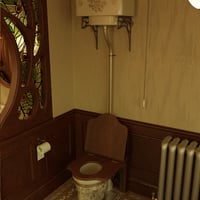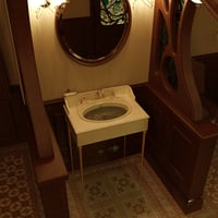 Presenting a beautiful Art Nouveau Bathroom, with highly detailed, custom crafted woodwork, and a stunning tiled floor and stained glass.