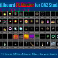 Billboards FX Master for Daz Studio is a set of 70 unique billboards special FX from fire and explosions to nebula's, lava, electricity, impacts, water and fog just to name a few; quite a collection! This set takes advantage of the new Daz Billboard plugin where your effect will follow the camera so besides scaling billboards to your required size you won't have to bother with rotating billboards every time you switch your camera view.