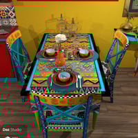 The colorful atmosphere of this Kitchen comes along with an enlightened cabinet and shelves, table and chairs with two material options and all decoration objects to give your Boho Scene the touch of "Bohemia" it needs.