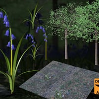 DA Blue Bell Woods consists of numerous Birch Tree & Blue Bell Flower props, including a high and low geometry version of most individual props. Also included are two complete ready to render scenes with custom configured group props and instance sets. Within the complete scenes the geometry set is surrounded by a high resolution environment dome in both a day and night time version to create a large detailed scene without the overhead of all that extra background geometry in your scene.