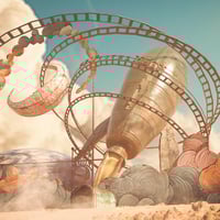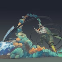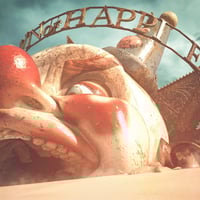 Under the pale glow of the moon, stands a Desolated Carnival, a relic of a forgotten world. The roller coaster, once a conveyer of exhilarating emotions, turns slowly like a wandering soul around a rocket and a crescent moon, evoking distant dreams of a bygone era. Beside it, a colossal clown head, its gaping mouth offering a mysterious entrance into the unknown.