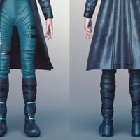 This outfit features a leather coat, t-shirt, pants, and boots, all with a futuristic finish and with the necessary adjustments for better control.