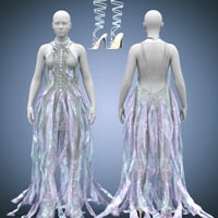 dForce Enchanting Ethereal Outfit for Genesis 9 is a jewel-encrusted dress with flowing translucent materials similar to the look of a jellyfish. It comes with a set of heels with straps climbing the leg, pearl necklaces, and brooches.