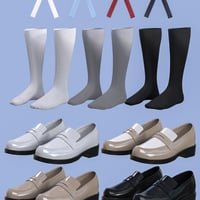 This is a preppy-style chic mini-dress outfit. It consists of a dress, blouse, loafers, socks, and ribbons. Thank you.