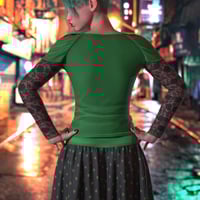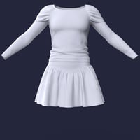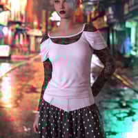 The dForce LV Emo Style Outfit for Genesis 9 consists of a lace and cotton t-shirt knit long sleeve top with cap-sleeve detailing, in trendy dark colours and black; as well as a denim weave and polyester skirt with V front waistband in dark colours and black, with the option of plain or polka-dot skirt bottom.