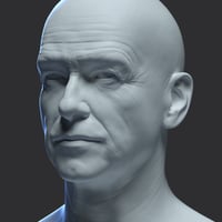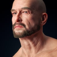 - A thick combed-back hair with a full, thick beard