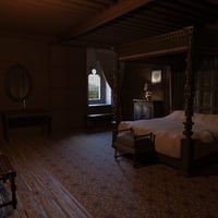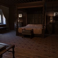 A traditional Medieval bedroom with detailed carved bed.