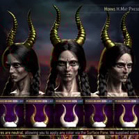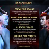 FPE Ridged Universal Horns will help give your Genesis 9 characters a demonic flair. Like with our previous product (FPE Universal Horns), the product consists of a set of socket morphs and two rigged horn props with various textures. The horns have 14 bones that you can bend, twist, twirl, shorten, or elongate into different shapes.