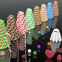 Each setup is completely modular, you can hide or replace ANY of the candy elements you wish, I've grouped candies by type so this can be easily accomplished, multiple candies are instances for optimization purposes. You can build your own unique Gingerbread House setup by deleting the grouped candies in a setup then loading your own candy from the props folder, each candy type loads in the center of the scene, then simply choose one of the materials to make your candy canes, gumballs and gummy candies truly your own!