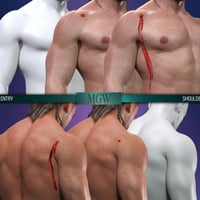 In addition, we have included a Wound to Scar material preset as a bonus that will add Opacity and change the translucency of the MGW Wound Geoshell to fade the textures. Play with the morph dials (break the limits and even dial them negatively) and change the translucency color to get the right look and transform the open wound into a scar as shown in the promos!