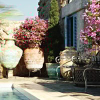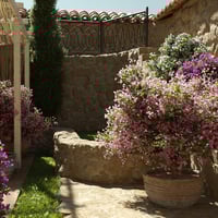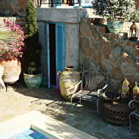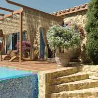 Here is the rustic retreat in the hills with old world charm...with weathered stone walls, rustic wooden shutters, terracotta roof tiles, boho style sun shade with rope covers, private pool and bouganvillea trees.