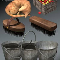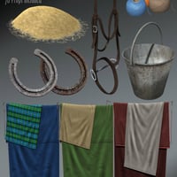 This comprehensive and detailed 3D model prop set includes 76 props for use in your stable scenes. Many of these props could also be used in several other situations, like in a garden or building site. Tools include a shovel, broom, pitchfork, hoof knife, stone hook, rasp, tongs, hammer, nails, poseable wheel barrow with several content options, barrel, crates, workbench, hanging bridle, saddle stand plus morphable saddle, twine strands, twine balls, several different sacks, hay bales, hay mound, plastic containers, large plastic bucket, smaller metal bucket, apple, apple crate, hanging horse blankets, feed bucket, static sleeping LoREZ Cat, Mug, Toolbox and scraper.