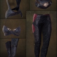 A five piece set of leather armor for drows, rouges or ascended thieflings. It attunes itself to the shape of the wearer, granting a +6 dexterity and a hefty bonus of +18 charisma. Comes in two colors, brown for those who reside in the material plane and black for those who have fallen to the shadowy veils.