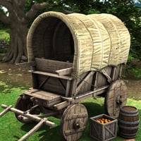 The medieval wagon comes with 4 different wagon types: a prison cage, a covered and uncovered transport and a full merchants wagon with 12 separate props. The set also comes with a bridle and harness for the DAZ Horse 2.