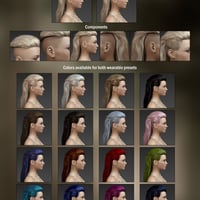 The hair is designed in a modular form to make it as versatile as possible. You can load it with or without the side sections and/or the braids to create different looks. The main set-ups are provided as 2 wearable presets, one with shaved sides, one with full hair. There are 16 colors for the full and shaved hair setups. There are also options to apply these colors to either the top only or to the sides only. There are also a few scalp options to give even greater styling choices.