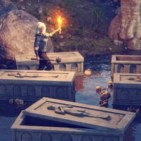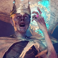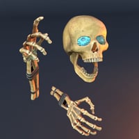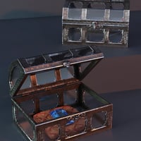 Featuring a highly detailed wooden chest with an interior full of coins and a working lid, latch, and handles, a lich's phylactery with a massive precious gemstone and functional lid, a half dozen bone scatter, potions, a large medieval sarcophagus with a working lid, a relic bone wand, rings, and a bejeweled crown.