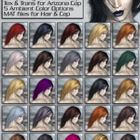 Quality textures for the Arizona Hair. This package features a wide range of choices from realism to fantasy to colored streaks. Choose any of the 31 colors to enhance the personality of your characters and give Arizona Hair a soft, touchable look with an all-new transparency map!