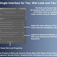 The wet and tanned skin shader also includes a dedicated Wet Layer controllable with the general basic properties (amount, roughness, bump) and additional advanced properties. You can reach the wet look you want, from dry to wet skins, thanks to the various wet options and bump presets included, and even more wet looks can be reached by using the global interface included.
