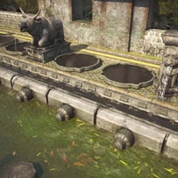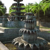 There's large main gate and 2 side gates. There are several fountains and foliage throughout the set.